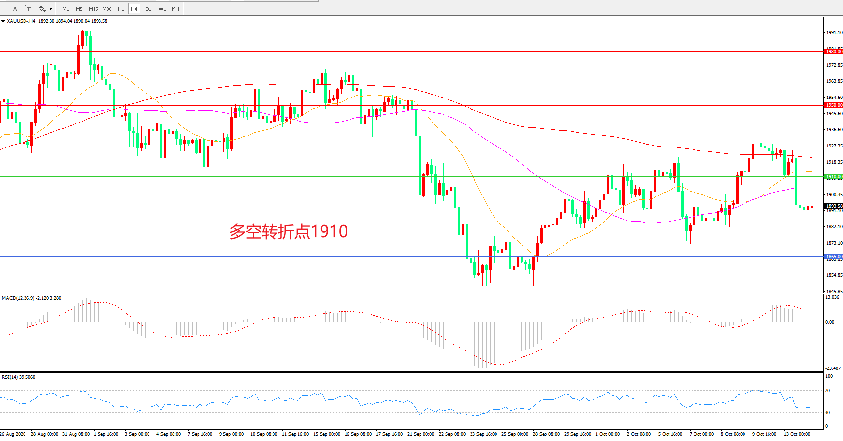 周二(10月13日),由于财政刺激计划僵局难解,叠加市场避险情绪升温,美元指数迎来强势反弹,摆脱了93.10下方的三周来盘中低谷,日内涨幅超过0.57%,现货黄金遭到打压,震荡下行后收报1891.76美元/盎司。