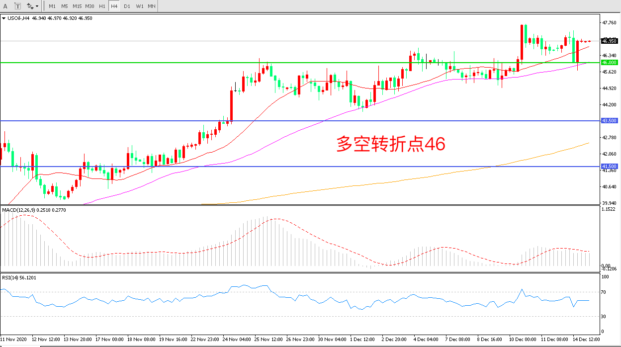 4小时图看,油价先跌后涨整体表现较为强势46美元支撑比较稳固均线系统呈多头排列MACD红柱减少RSI指标走平,日内震荡上行概率较大。