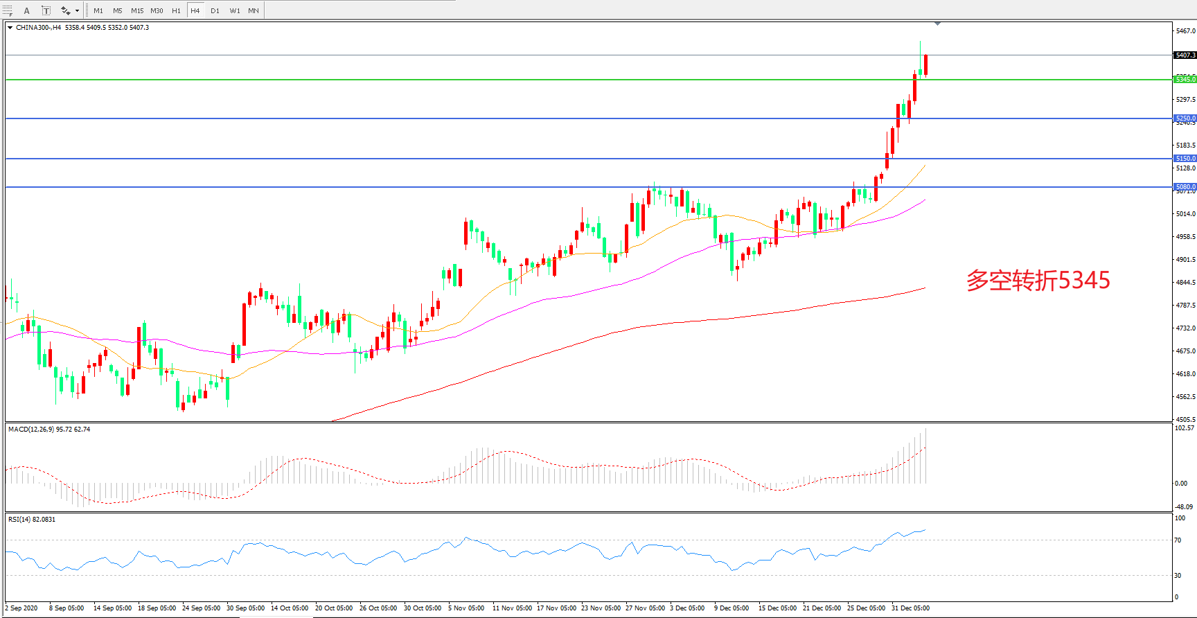 4小时图看,沪深300回踩5345后再度上行,短期表现强势,均线系统拐头向上,MACD红柱增加,RSI指标向上,日内延续上行概率较大。