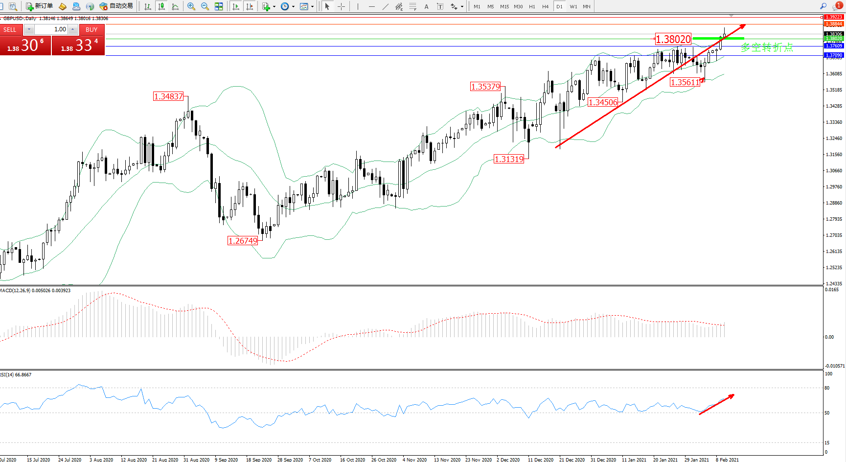 交易策略:1.37786上方看涨,目标1.38844、1.39223