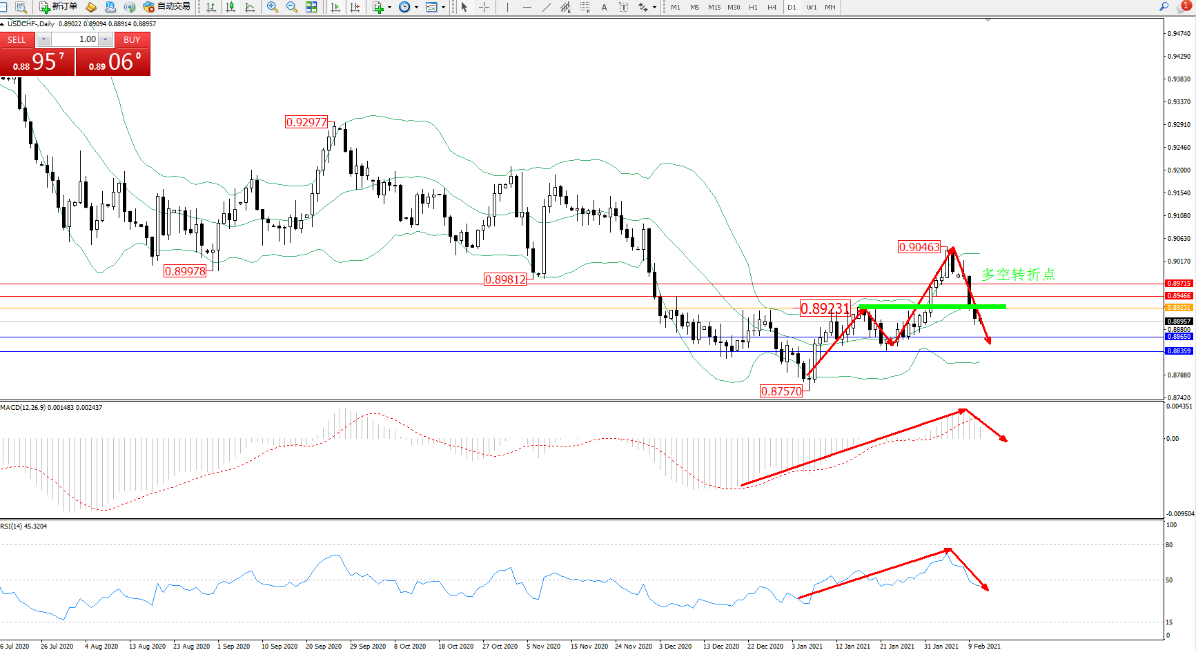 技术点评:多头动力维持在布林带指标通道中上轨区间持续震荡上扬,高位抵达0.90463位置节点后遇阻急速回撤下行,跌破布林带指标中轨附近节点后持续下挫中,布林带指标呈张口走势后有收口迹象,关注中轨下方附近关键节点,MACD指标处于多头区域维持震荡平移中,RSI指标处于多头区域高位震荡后缓慢回撤至50均衡线附近徘徊中;