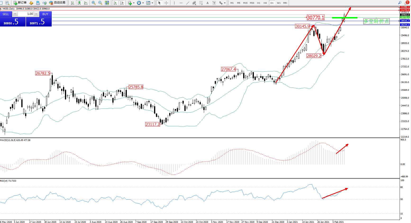 香港恒生指数2月17日(周三)收盘上涨338.28点,涨幅1.10%,报31084.94点;港股主要指数低开高走,延续昨日上涨行情,市场依旧牛气冲天。恒指午后涨幅进一步扩大,自18年6月以来首次站上三万一关口;蓝筹金融股及科技股领涨,恒生科技指数涨2.34%报10945点再创历史新高。香港陆续放开限制及娱乐场所开园,香港本地股普遍造好;昨日大涨的影视娱乐股未能延续强势行情,阿里影业跌超7%,昨日暴涨34%。京东集团大涨6.44%破顶,市值超1.3万亿港元。当前加大港股配置仍是性价比很高的选择,2021年投资港股性价比将高于A股、美股。从盈利来看,随着我国经济的不断好转,港股的盈利增速也会逐步修复。目前AH溢价处于历史高位,性价比高。从未来发展来看,目前很多互联网龙头公司在港股上市,高科技企业将继续优化香港市场的结构,港股市场的稀缺标的优势将继续显现,另外,南下的资金参与港股的程度越来越高,南下资金能够去捕捉折价所带来的超额收益,推升港股估值。