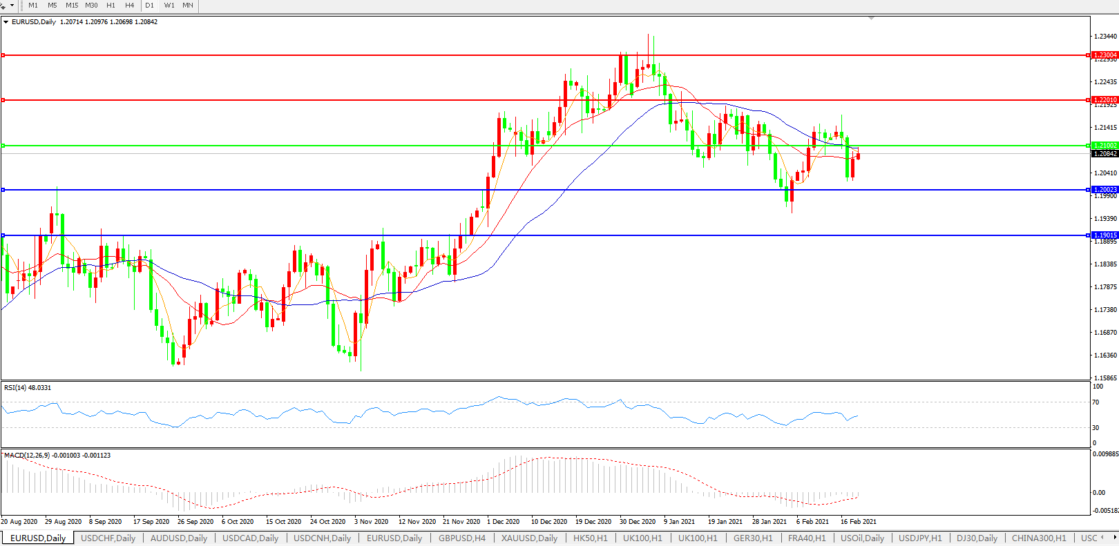 交易策略:1.2100下方看跌,目标1.2000、1.1900