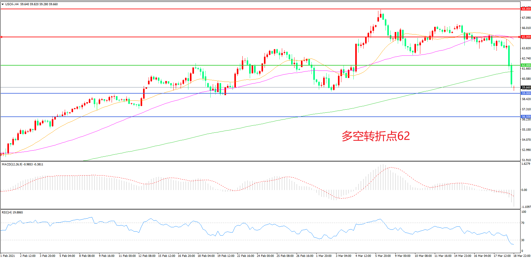周三(3月17日),美国10年期国债收益率持续走高,反映了市场对通胀的担忧,而这种担忧情绪也传染给了大宗商品市场,油价在连日的小碎步似的下跌后终于扛不住压力,价格如同决堤的洪水一般飞泻。美国WTI原油出现闪崩,重挫逾9%后收报59.55美元/桶,创造了半年以来最大单日跌幅。