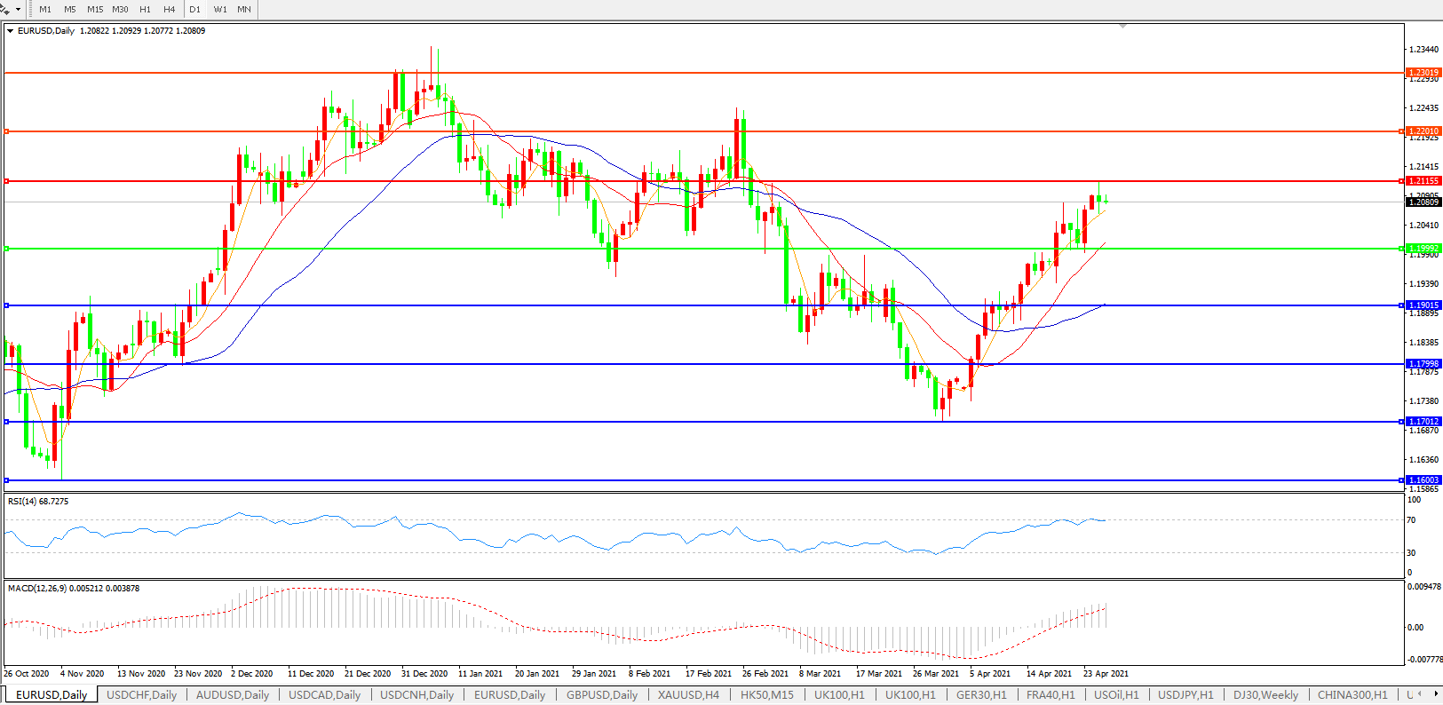 技术面简析:日图均线呈多头排列,汇价持续发力上行,MACD上穿0轴且量能有持续放量迹象,RSI超买区域附近徘徊,预计短期汇价大概率将在整理后进一步上行。