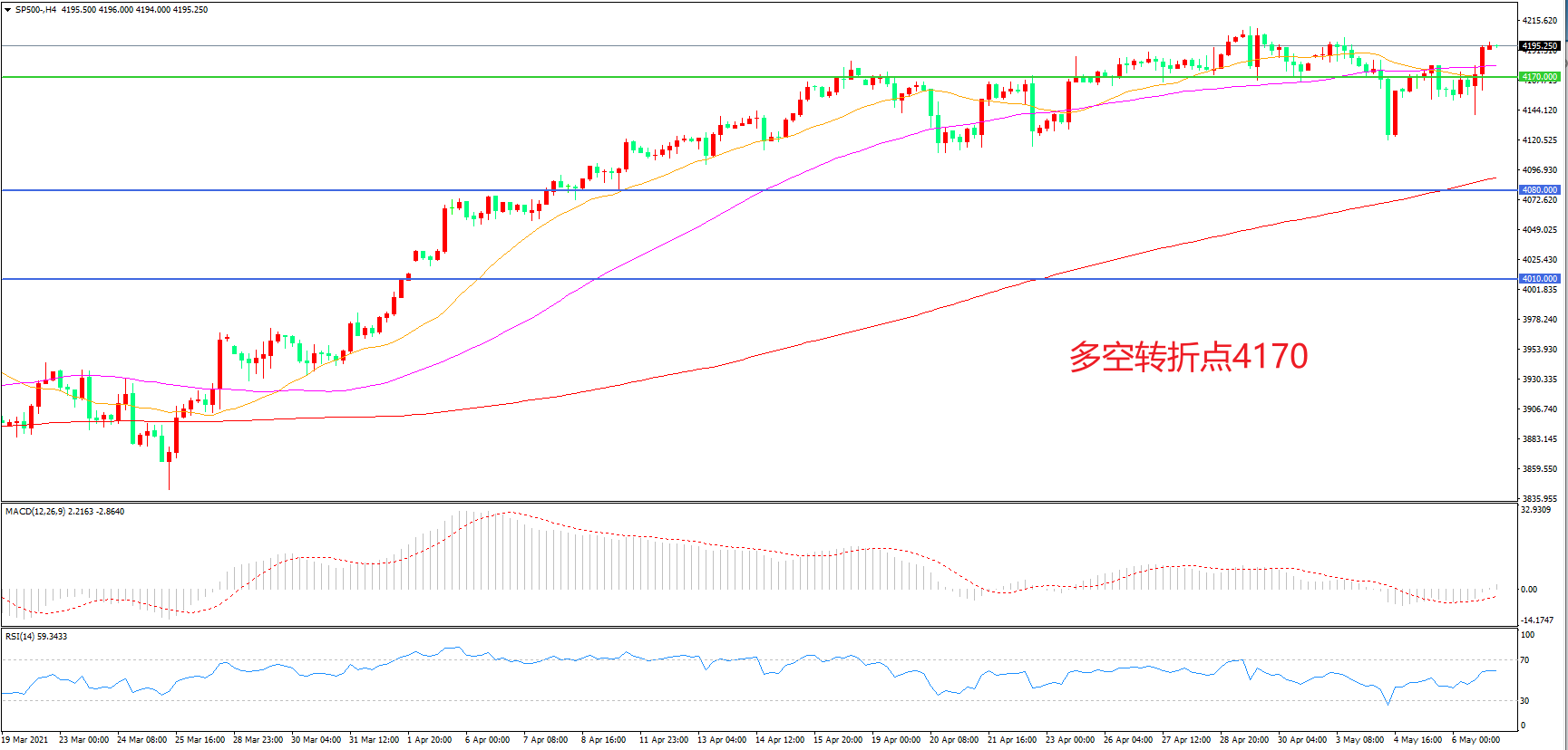 周四(5月6日),上周首次申请失业救济人数超预期下降,疫情爆发一年多来首次降至不足50万人,靓丽的数据表现推振市场乐观预期,标普500大幅拉升,收报4195.50点。标普500的11大板块全线收涨,涨逾1.4%的金融领涨,消费品、电信服务、信息技术也都涨逾1%。大型科技股方面,除奈飞外,均在尾声时转涨,苹果、Facebook、亚马逊、微软涨超1%。