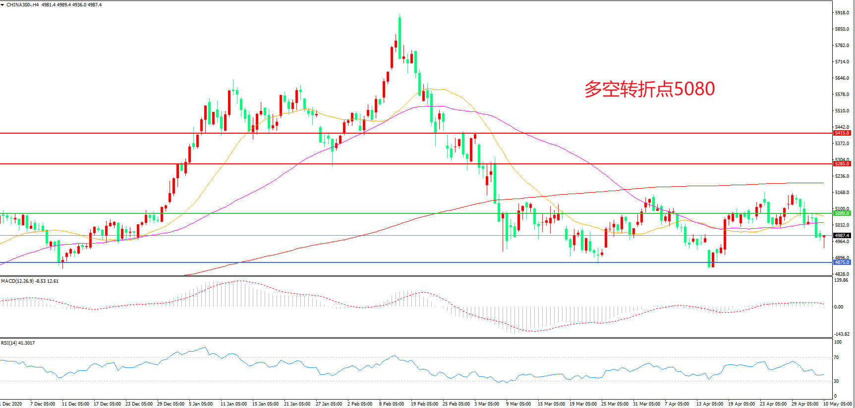 4小时图看,沪深300长阴破位,整体表现十分低迷,55周期均线支撑被击穿,5080成为上方阻力, MACD红柱缩短,RSI指标向下,日内震荡下行概率较大。
