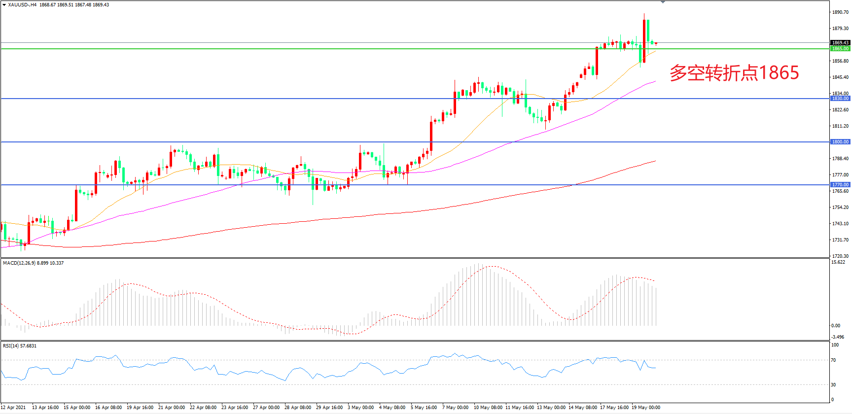 周三(5月19日),加密货币市场惨遭“血洗”!比特币一度狂崩30%,以太坊暴跌近43%,恐慌指数VIX涨超20%,机构投资者似乎开始抛弃比特币,转而买入更为传统的黄金,金价一度大幅拉升至1890美元附近,但随后公布的美联储会议纪要显示,若经济继续迅速复苏,联储可能考虑调整当前的宽松政策,美元指数刷新日高,10年期美债收益率刷新四日高位,金价冲高回落,收报1868.16美元/盎司。