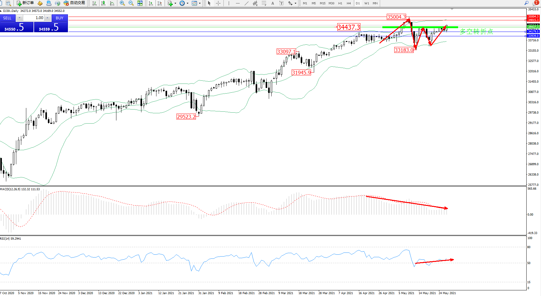 道琼斯指数5月27日(周四)收盘上涨138.83点,涨幅0.40%,报34461.88点;美股收盘,道指初步收涨,据报拜登将公布的预算案将使下一财年联邦支出跃升至6万亿美元,该消息激发投资者对美国经济的乐观情绪,同时提高了债券供应增加风险。此外,各地中央银行正在着手准备撤出紧急货币政策支持,美联储少数官员迫切希望开始讨论缩减购债规模,这些也对债市构成冲击。美联储卡普兰表示,我们正处于经济复苏之中,将继续朝着美联储的目标前进,此外尽早开始谈论缩减资产购买是明智的。 对资产购买采取一些限制措施将是有益的。 我们需要提前很长时间来表明缩减购债规模的意图,并应逐步调整购买规模。缩债时机来临的时候,会提前向市场传达。