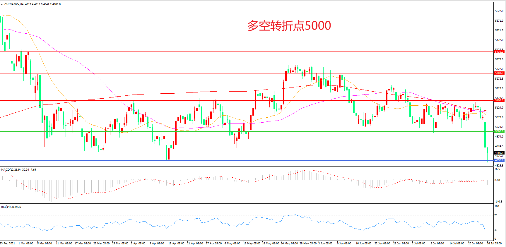 交易策略:在5160.00之下看跌,目标4850.00             4730.00