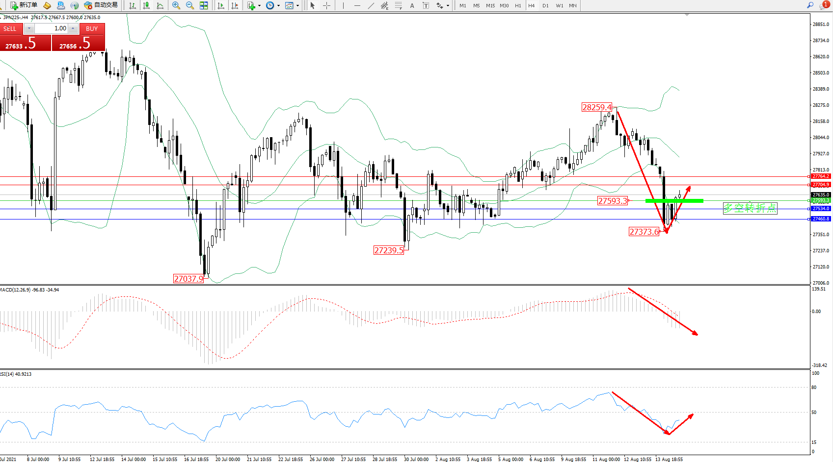 技术点评:空头动力延续布林带指标通道下轨附近持续震荡下行,低位抵达27373位置附近得到支撑开始震荡缓慢上移,短期或将维持底部震荡中,布林带指标呈张口走势后开始有收口迹象,MACD指标空头动力持续震荡下行至空头区域底部整理,RSI指标持续震荡下行后低位开始有反转上移迹象;