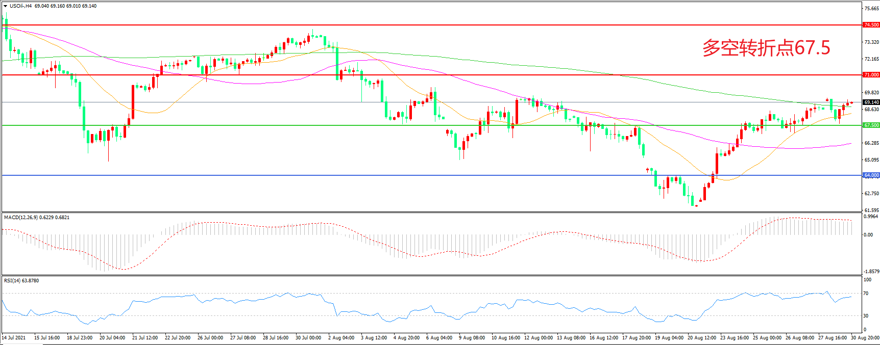 4小时图看,油价突破67.5美元后延续窄幅震荡,整体表现偏强,200周期均线成为下方支撑,71美元成为上方阻力,MACD红柱增加,RSI指标走平,日内震荡上行概率较大。