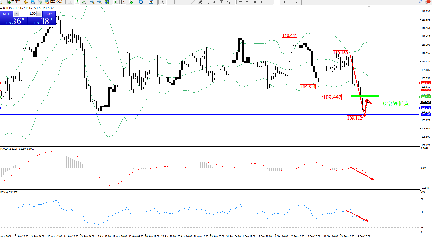技术点评:空头动力延续布林带指标下轨附近节点持续下探,低位抵达109.112位置后得到支撑饭上移,多头动力短期伺机入场,但下行趋势态势良好,短期未见最终止步迹象,布林带指标呈张口走势中,MACD指标处于0轴线下方空头区域不断下移后开始平移,RSI指标处于50均衡线下方空头区域维持弱势整理平移;