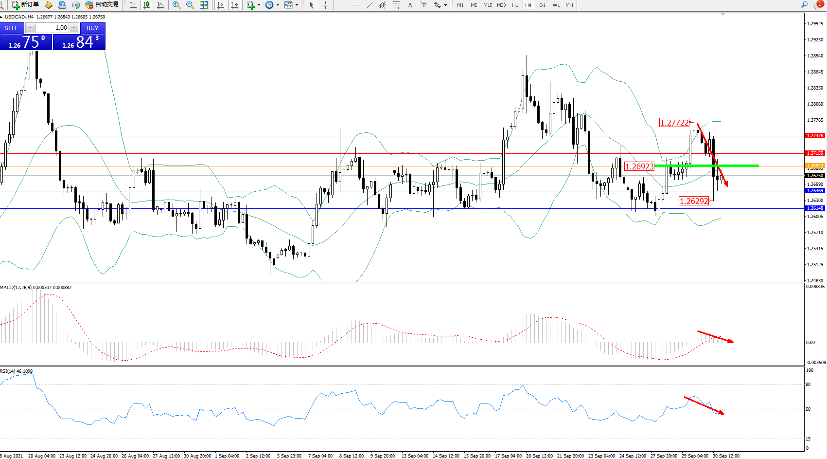 交易策略:1.26923下方看跌,目标1.26469、1.26148