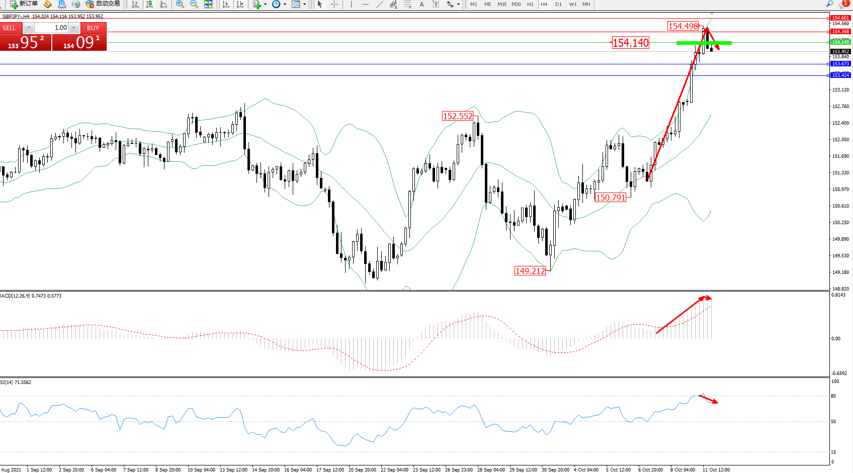 技术点评:多头动力延续布林带指标上轨附近节点持续震荡上扬,高位抵达154.498位置后短期遇阻整理回撤,空头动力有开始伺机入场迹象,布林带指标呈张口走势后开始有缓慢收口迹象,MACD指标处于多头区域维持震荡上移中,RSI指标处于多头区域持续震荡上移至80均衡线附近遇阻开始调整;