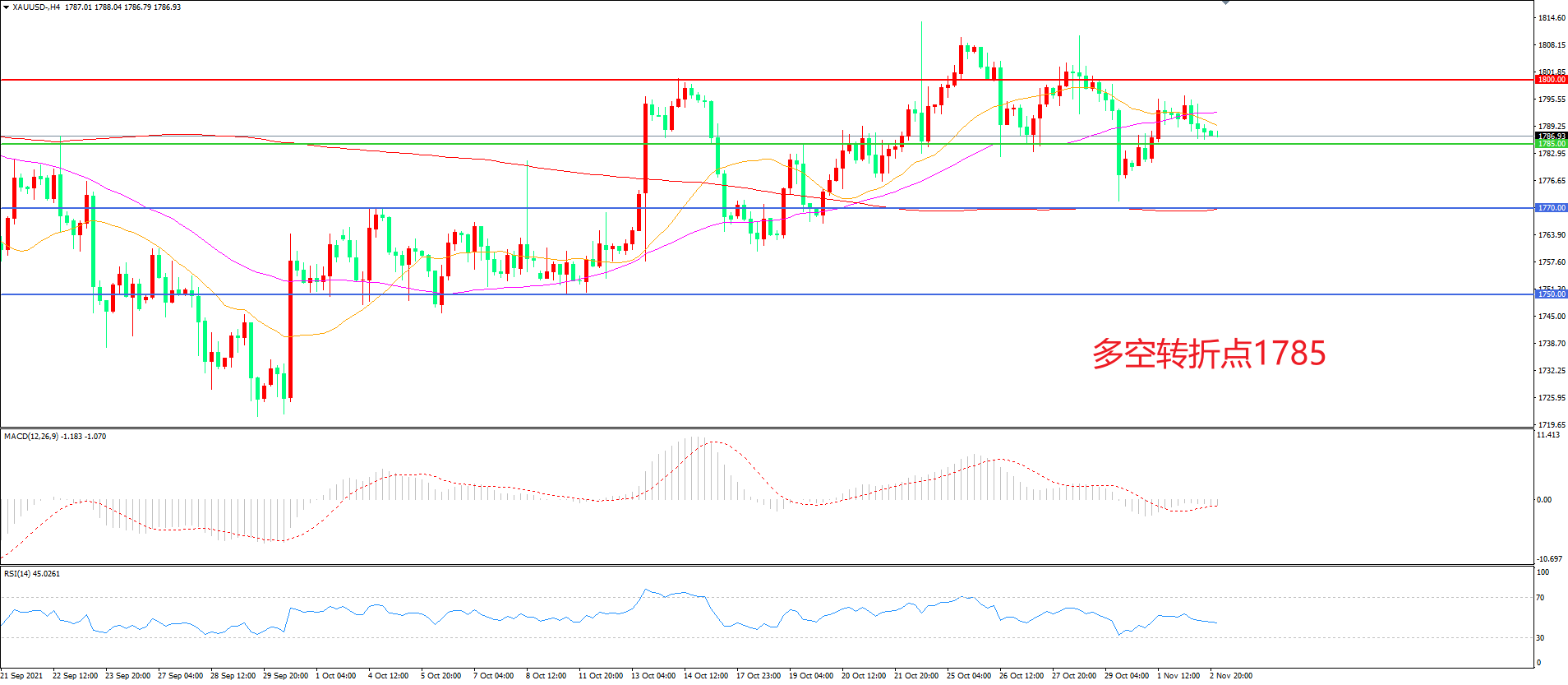 4小时图看,金价小幅冲高后震荡回落,短期走势表现低迷,均线系统成为上方阻力,1785成为多空分水岭,MACD红柱增加,RSI指标走平,日内延续震荡概率较大。