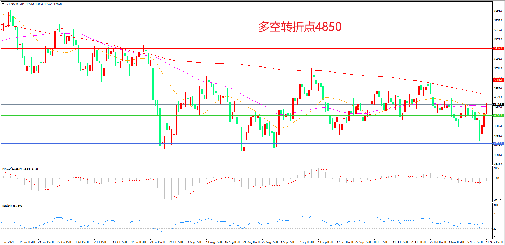 周四(11月11日),沪深两市小幅低开,但伴随着金融与地产协力做多,市场出现全线反弹,沪深300迅速上扬,收报4897.8点。两市成交额高达11232亿,北向资金流入超百亿。短线来看,沪深两市放量反弹之后,市场仍有惯性上攻的动能,但金融地产板块的行情能否延续决定着指数的反弹力度和空间,如果金融房地产板块行情难以延续,沪深300仍将再次回落。