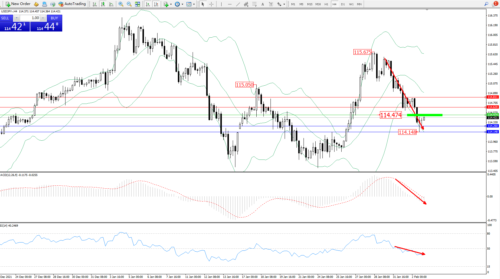 交易策略:114.474下方看跌,目标114.260、114.148