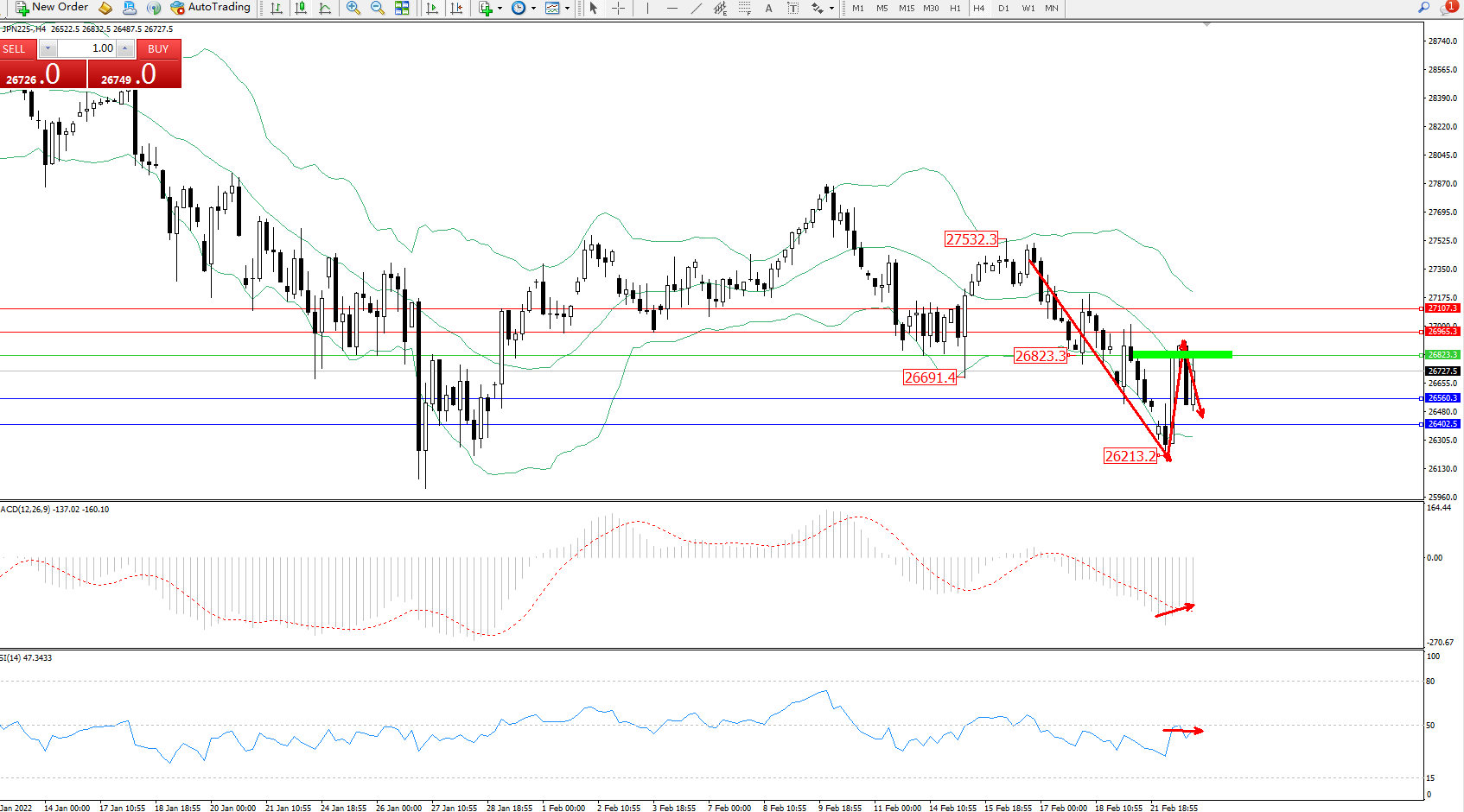 日经225指数2月22日(周二)收盘下跌453.37点,跌幅1.68%,报26457.50点。日本首相岸田文雄:不能接受俄罗斯的一系列行动。准备包括制裁措施在内的对俄回应。将收集信息,与G7其他国家保持联系。将密切关注乌克兰局势。俄罗斯的行为违反了明斯克协议。如果俄罗斯“入侵”乌克兰,将进行强烈回应。