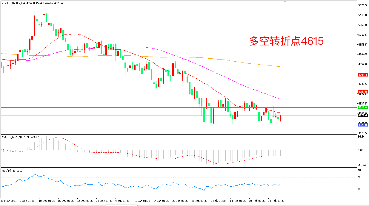 4小时图看,沪深300延续低位调整,区间震荡迹象明显,4615成为上方阻力,4520成为下方支撑, MACD绿柱增加,RSI指标走平,日内延续震荡概率较大。