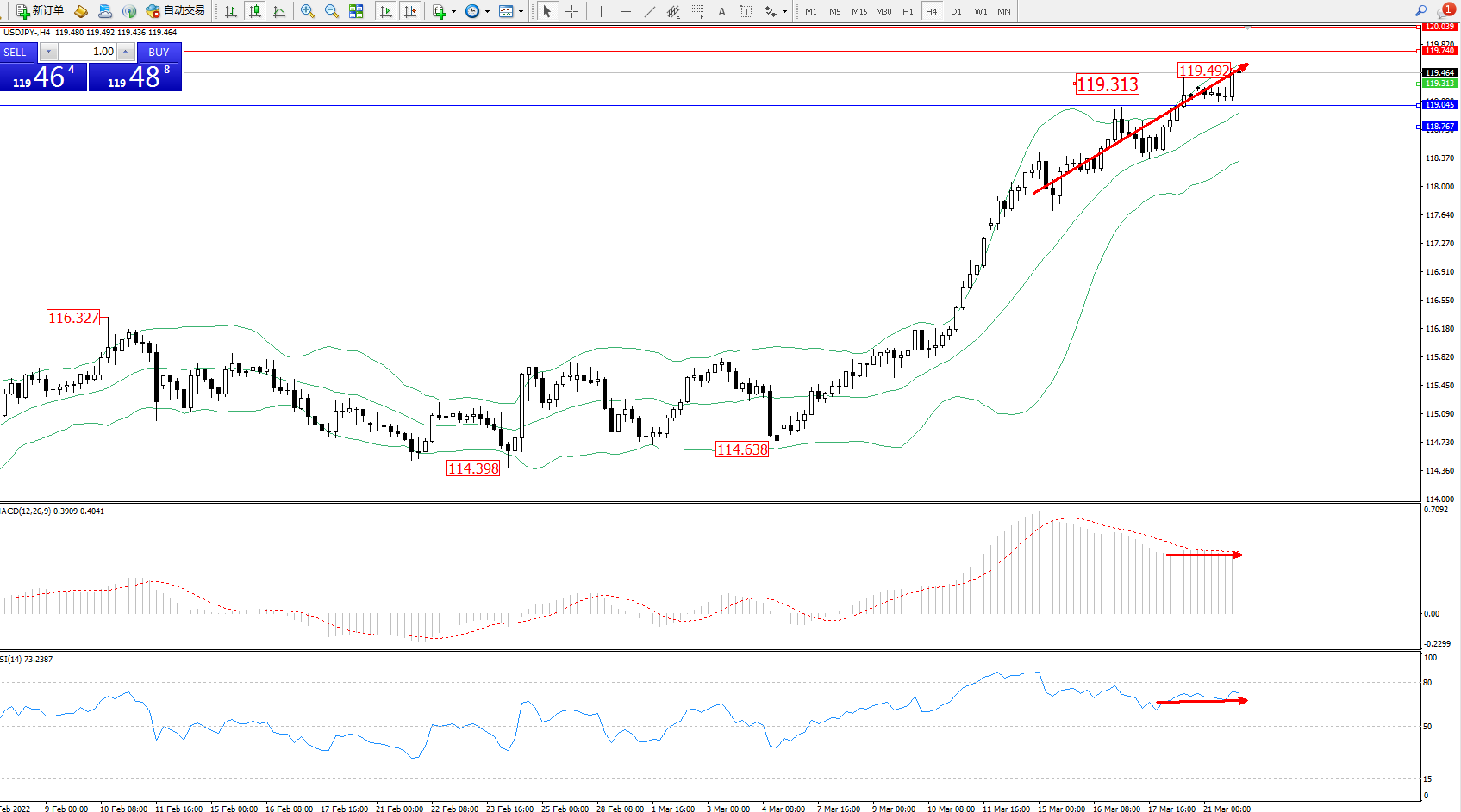 技术点评:多头动力延续布林带指标通道中上轨区间持续震荡上扬,高位抵达119.492位置附近整理后有继续上移迹象,布林带指标呈上行趋势通道走势良好,短期上行动力未见最终止步迹象,MACD指标处于多头区域维持整理平移,RSI指标处于多头区域高位维持弱势徘徊中;