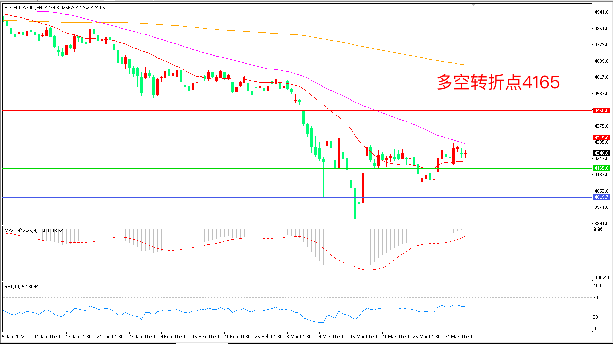 4小时图看,沪深300以21周期均线为依托窄幅震荡,短期面临方向选择, MACD绿柱缩短,RSI指标走平,日内震荡上行概率较大。