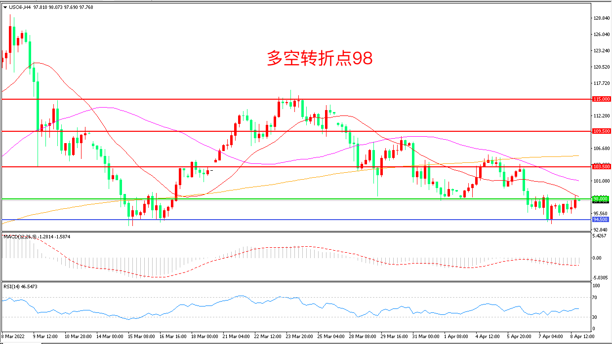 4小时图看,油价跌破98美元后窄幅震荡,横盘迹象明显,均线系统呈空头排列,MACD绿柱增加,RSI指标走平,日内延续震荡概率较大。