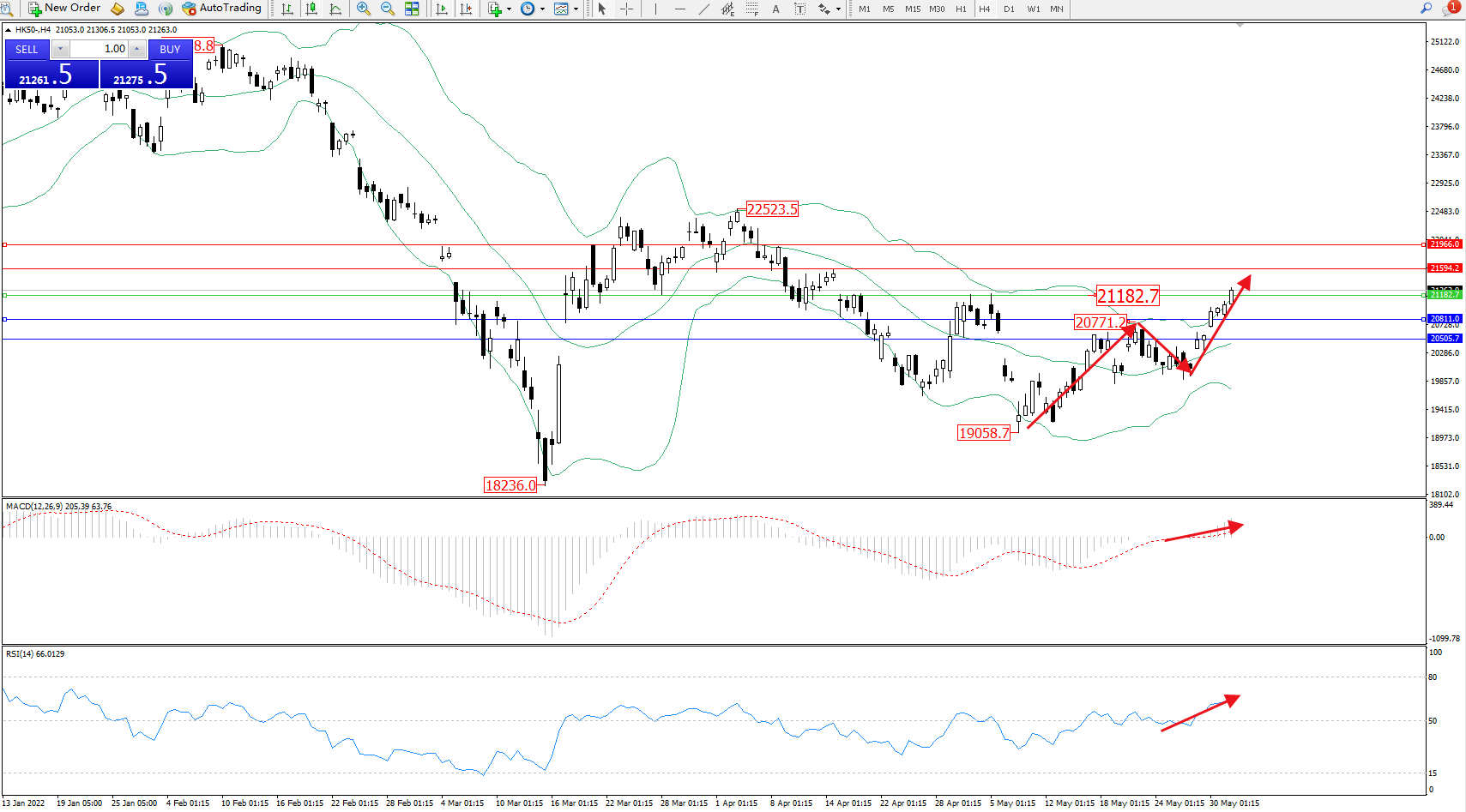 香港恒生指数5月31日(周二)收盘上涨291.27点,涨幅1.38%,报21415.2点;上海明日起全面复工复产,恢复正常生产生活秩序阶段。市场情绪高涨,港股低开高走延续反弹行情,恒生科技指数涨3.02%,大型科技股集体走强,百度、快手涨7.19%,美团涨近7%,腾讯涨3.5%,京东、阿里巴巴涨超1%。
