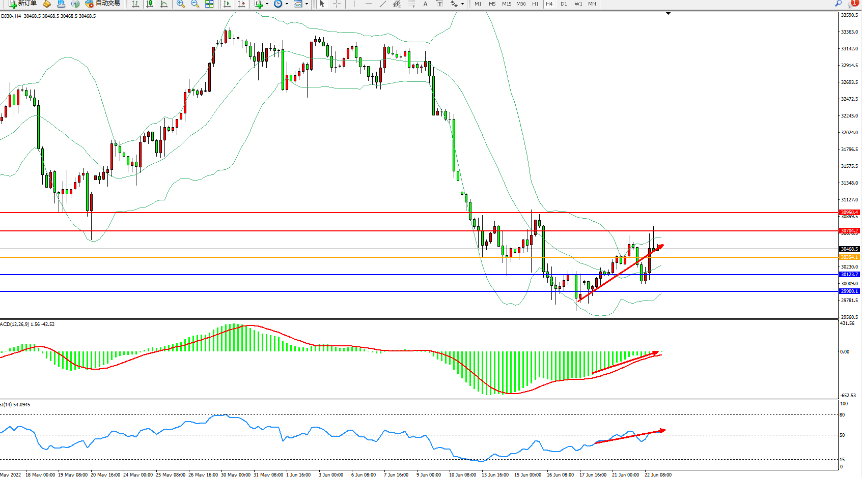 道琼斯指数6月22日(周三)收盘下跌48.37点,跌幅0.16%,报30481.88点;美联储主席鲍威尔:一连串额外的加息已被市场消化,这是合适的。最新的通胀指标表明,我们需要加快加息步伐。