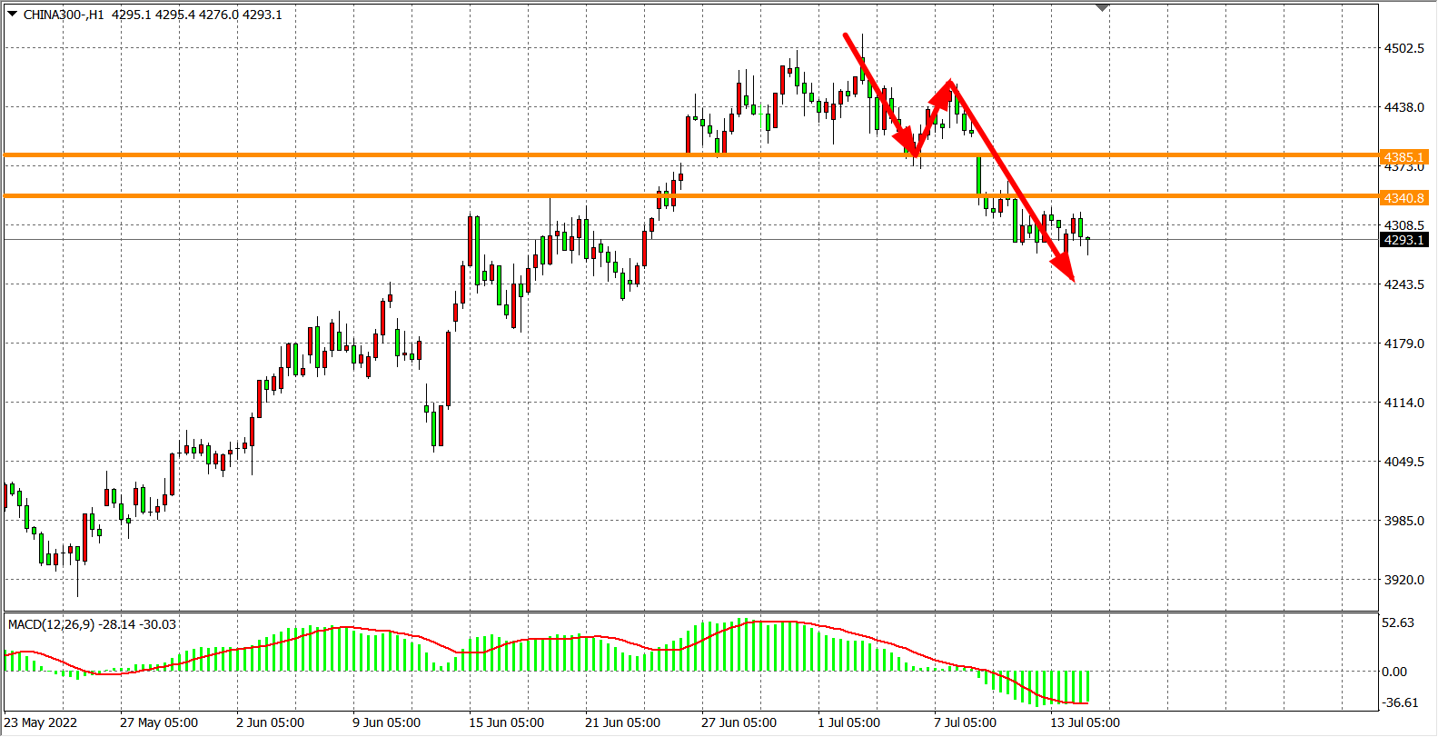1小时图看,沪深300在4340之下窄幅盘整,MACD于零轴之下量能开始缩短,短线走势进入震荡,行情走势偏弱,日内在4340之下继续看回调,下方看4250-4200