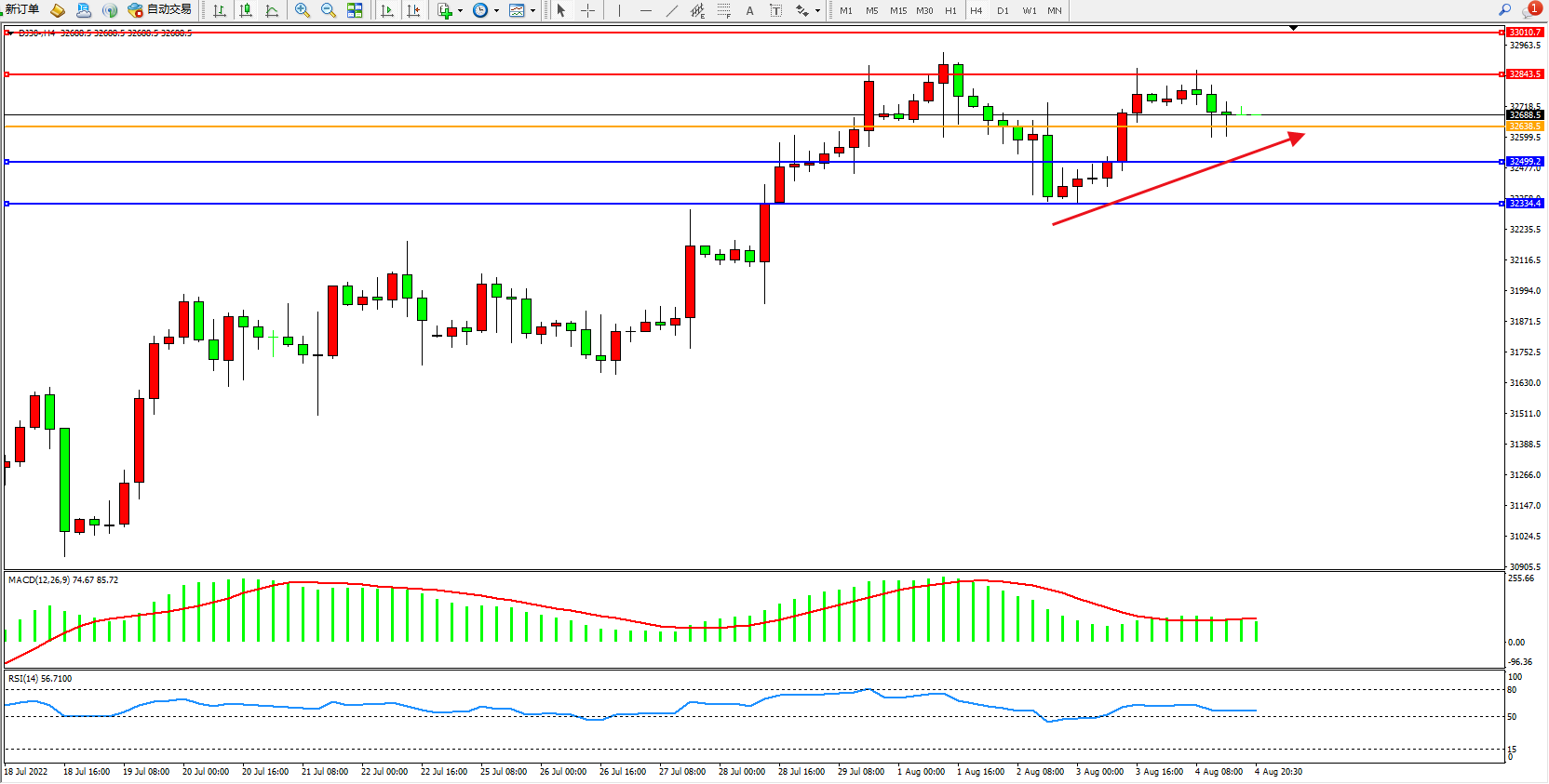 道琼斯指数8月4日(周四)收盘下跌85.31点,跌幅0.26%,报32727.19点;美国初请失业金人数小幅上升,接近去年11月以来的最高水平,表明劳动力市场继续放缓。