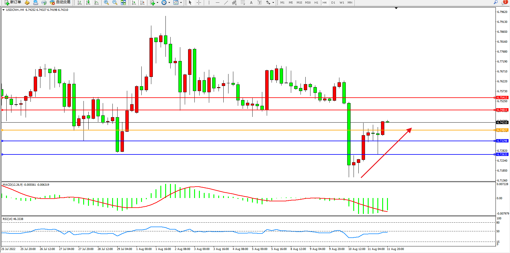 交易策略:6.73827上方看涨,目标6.74811、9.75413