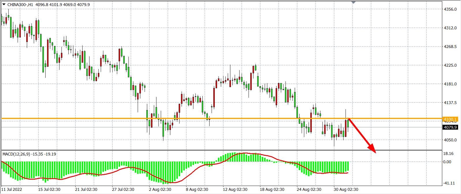 1小时图看,沪深300反弹4100后再度受阻回落,但在4050附近获得支撑,总体趋势偏震荡,MACD于零轴之下量能依旧较大,预示行情大概率进入宽幅震荡,当前阻力依旧看4100一线,在4100之下看继续跌,目标4050-4000,上破4130看涨,目标4150-4200