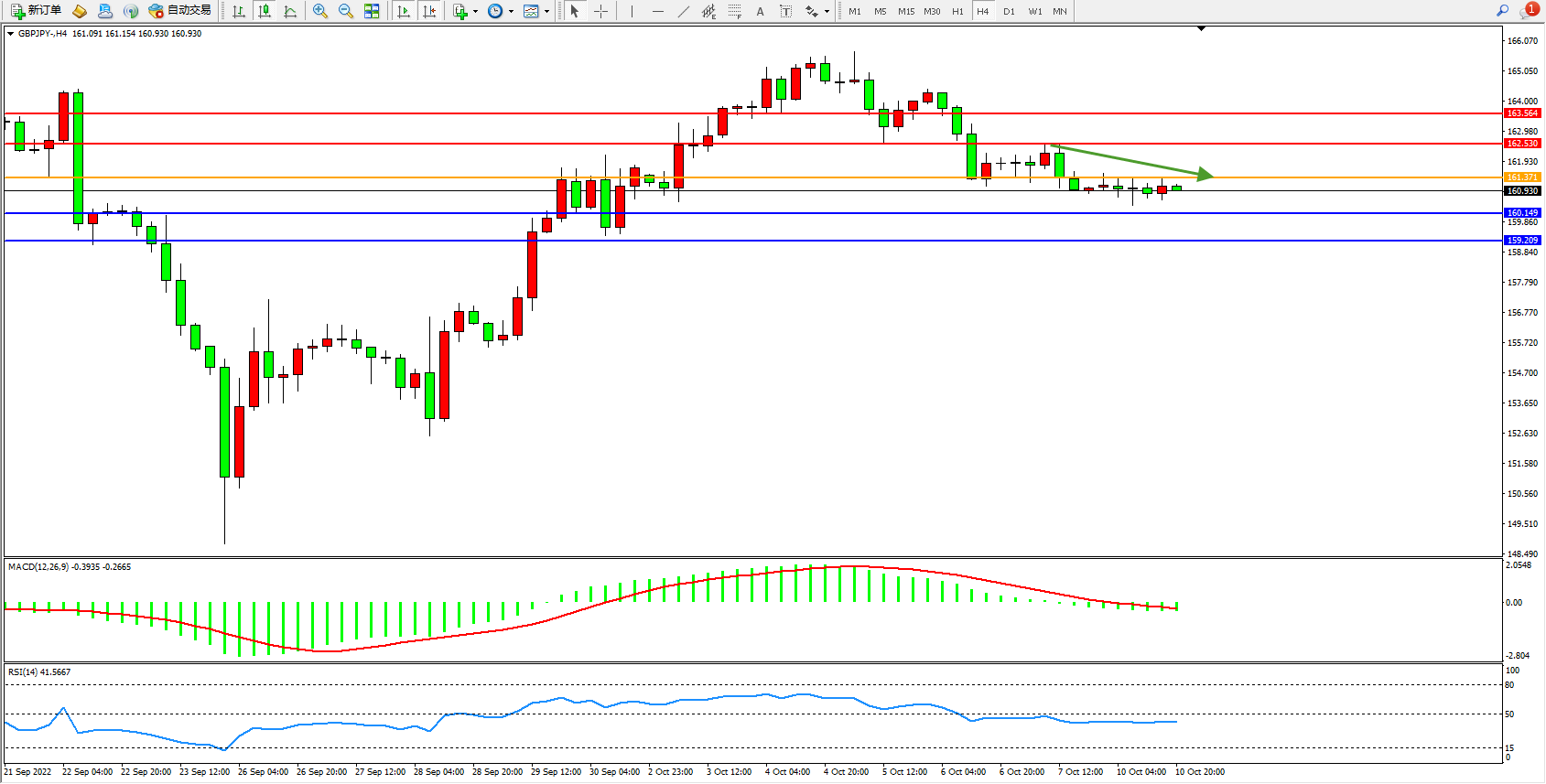 4小时图看:高位空头动力维持弱势窄幅整理,短期有继续维持弱势徘徊迹象,MACD指标处于0轴线附近窄幅徘徊,RSI指标处于50均衡线下侧弱势整理;