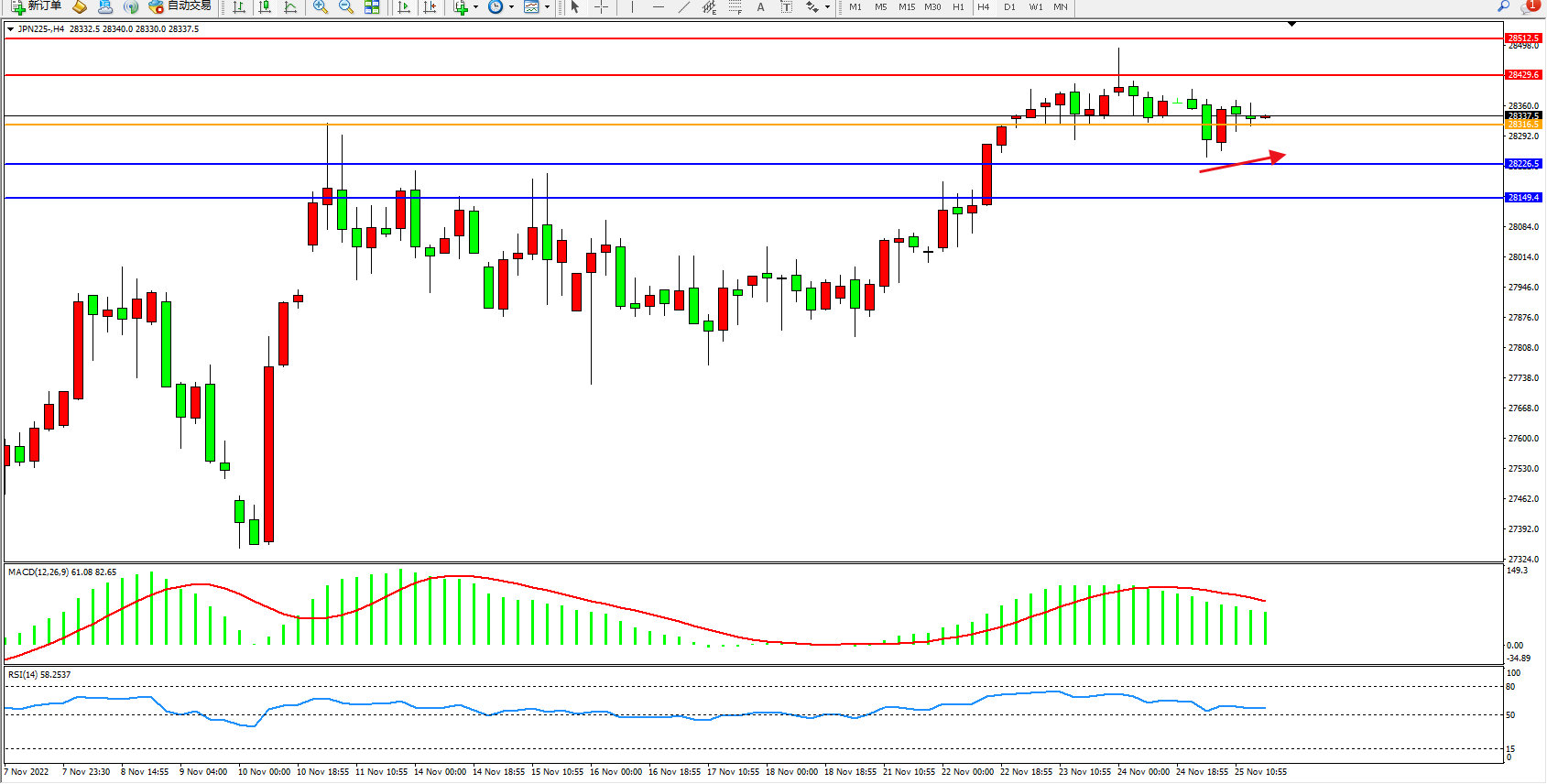日经225指数11月25日(周五)收盘下跌88.59点,跌幅0.31%,报28294.50点。日本首都东京11月核心消费者物价指数(CPI)同比上涨3.6%,增幅高于市场预测的3.5%及10月的3.4%。物价同比涨幅创40年来高位,且连续第六个月高于央行的2%目标,显示通胀压力扩大迹象。