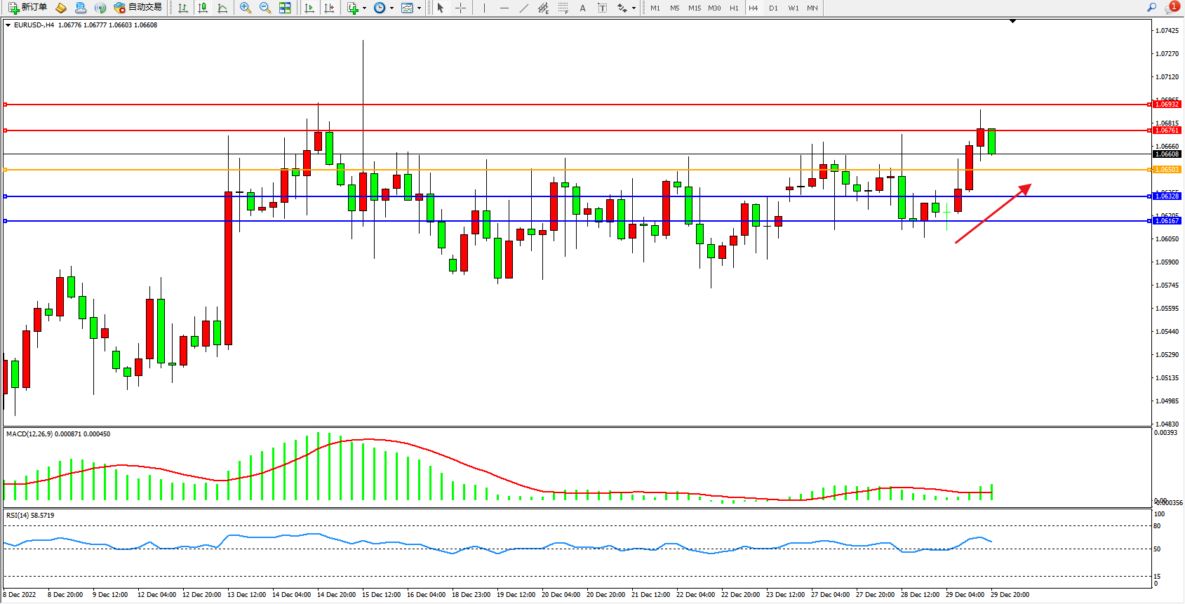 欧元兑美元维持1.06608附近震荡,欧元区面临非常困难的经济形势,在明年第二季度经济重新开始增长之前,欧元区正在经历一场短暂而轻微的衰退。尽管经济面临下行压力,但鉴于通胀仍然居高不下,欧洲央行也在继续紧缩的政策。