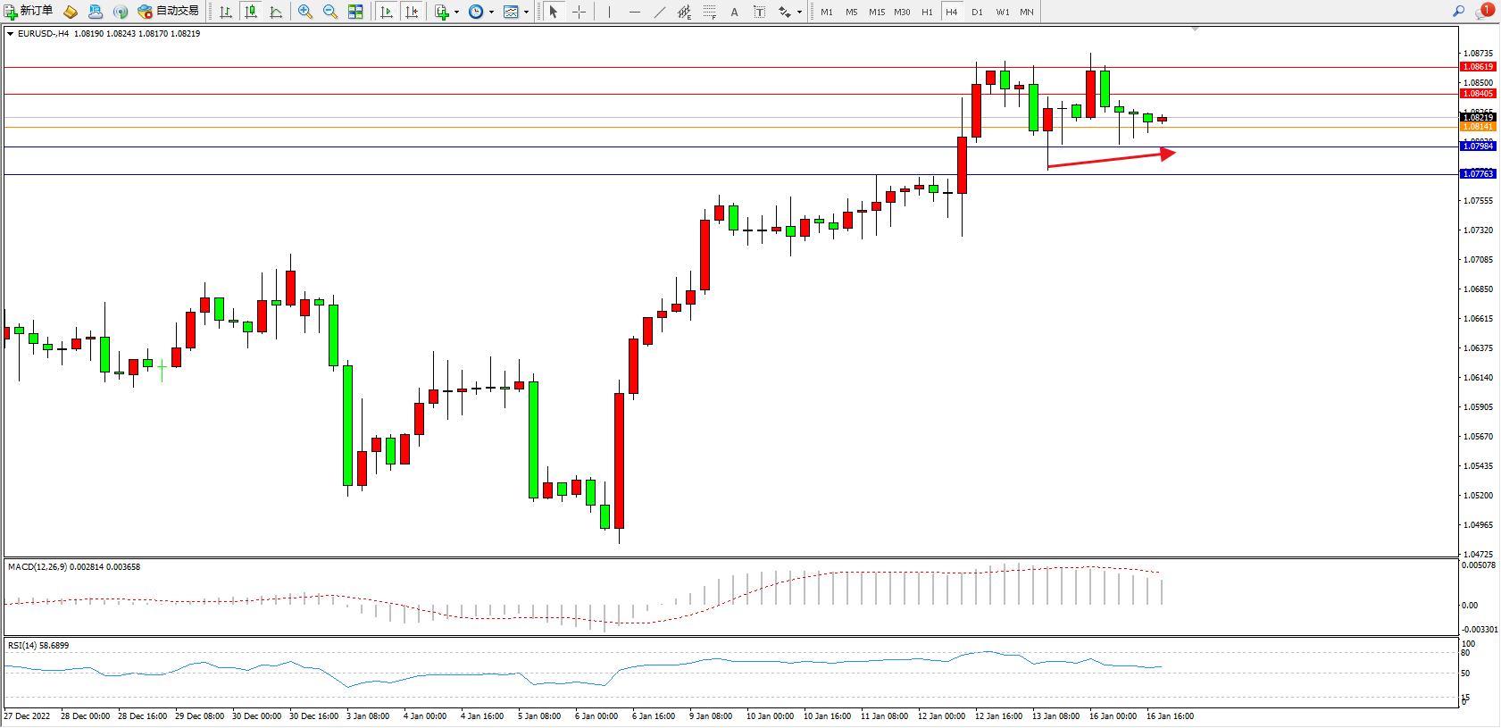 欧元美元EURUSD—4小时K线图显示: