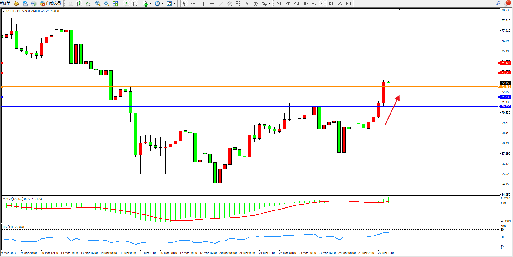 原油USOil——4小时K线图显示: