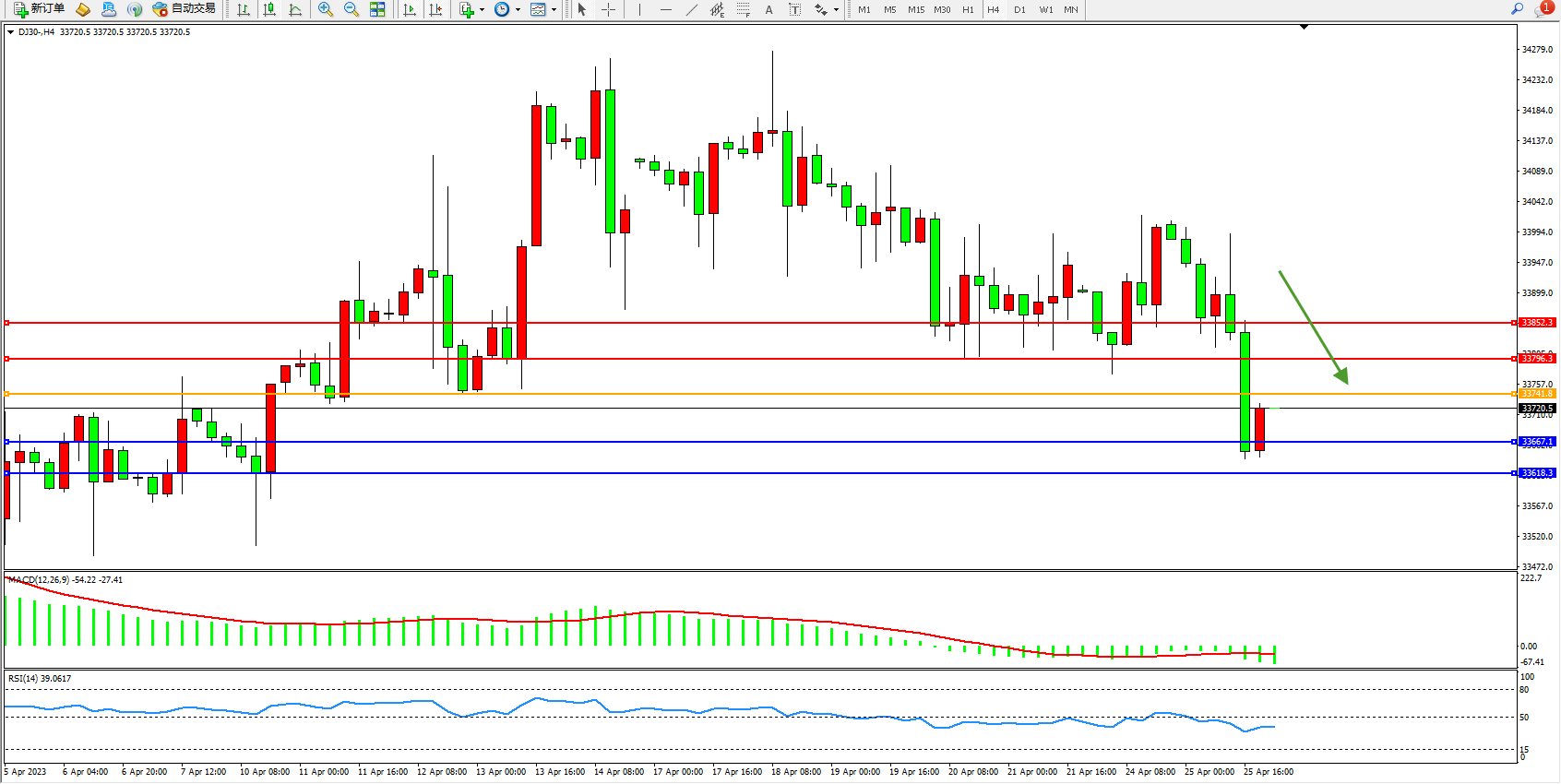 4小时图看:空头动力强势下挫,短期跌势或将延续,市场整体处于空头不断下移中,MACD指标处于0轴线下侧徘徊,RSI指标处于50均衡线下侧弱势整理;