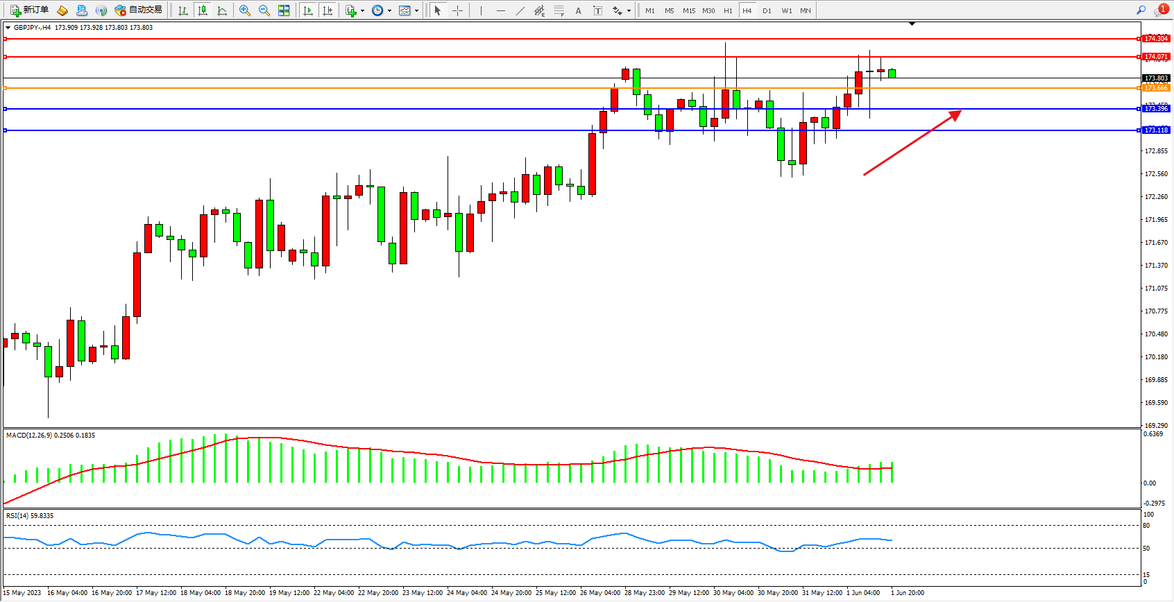 交易策略:173.666上方看涨,目标174.071 174.304