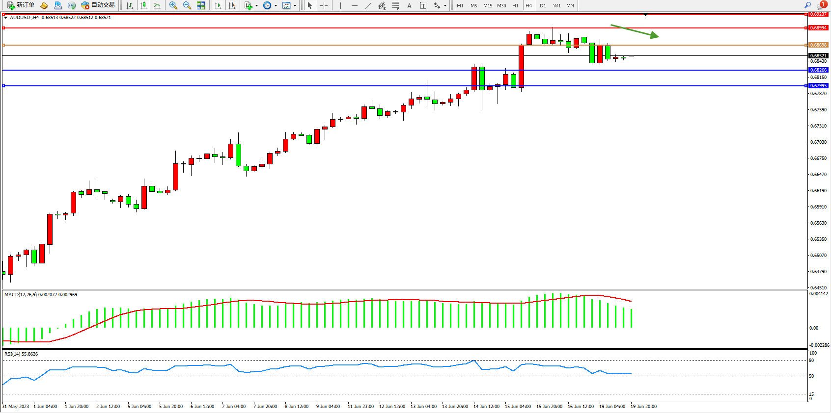 交易策略:0.68698下方看跌,目标0.68266  0.67995
