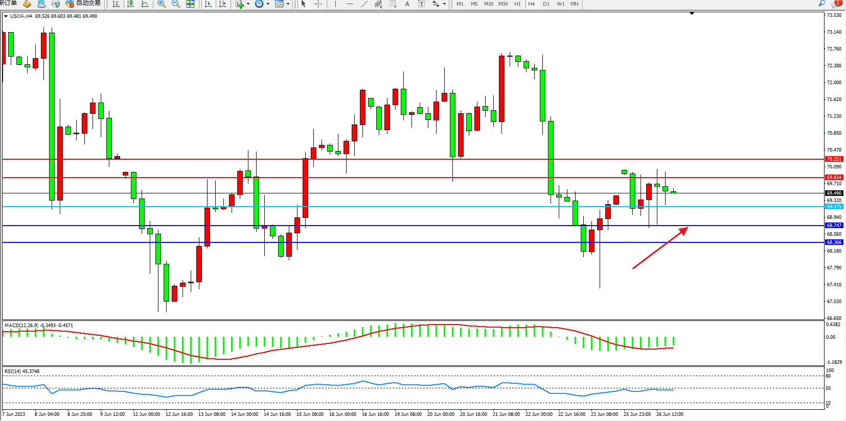 原油维持69.490附近震荡,国际油价在冲高逾1%后回落转跌。尽管俄罗斯雇佣兵上周末发动叛乱,引发了人们对俄罗斯石油供应中断的担忧,但事件最终得到平息,对市场影响相对有限。油价可能会保持区间波动。