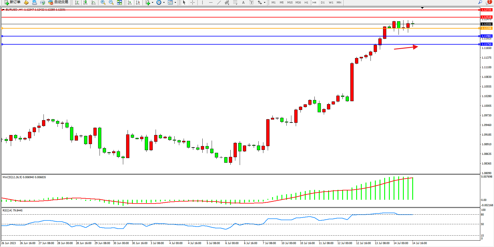 欧元美元EURUSD—4小时K线图显示: