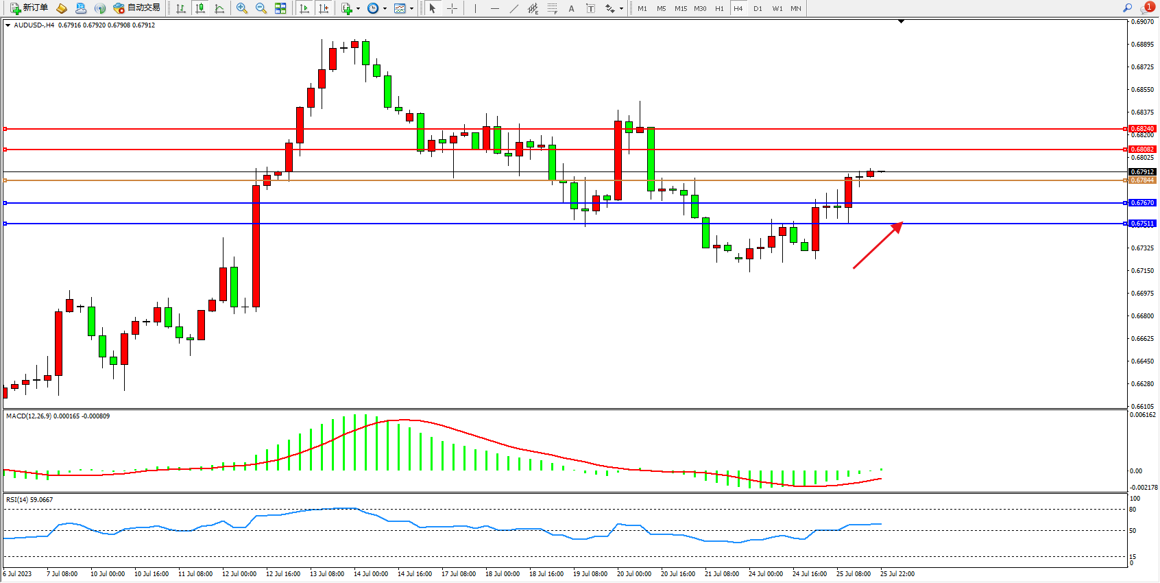交易策略:0.67844上方看涨,目标0.68082  0.68240