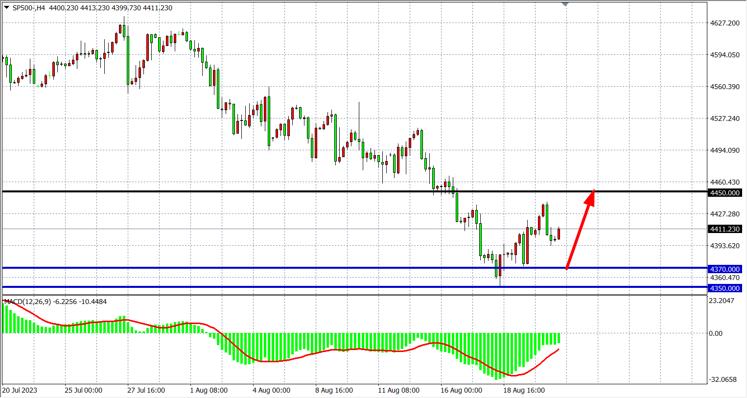 4小时图看,标普反弹4440后再度受阻回落,MACD量能在零轴下缩量,行情走势仍较疲弱,阻力关注4450附近,支撑关注4370-4350。