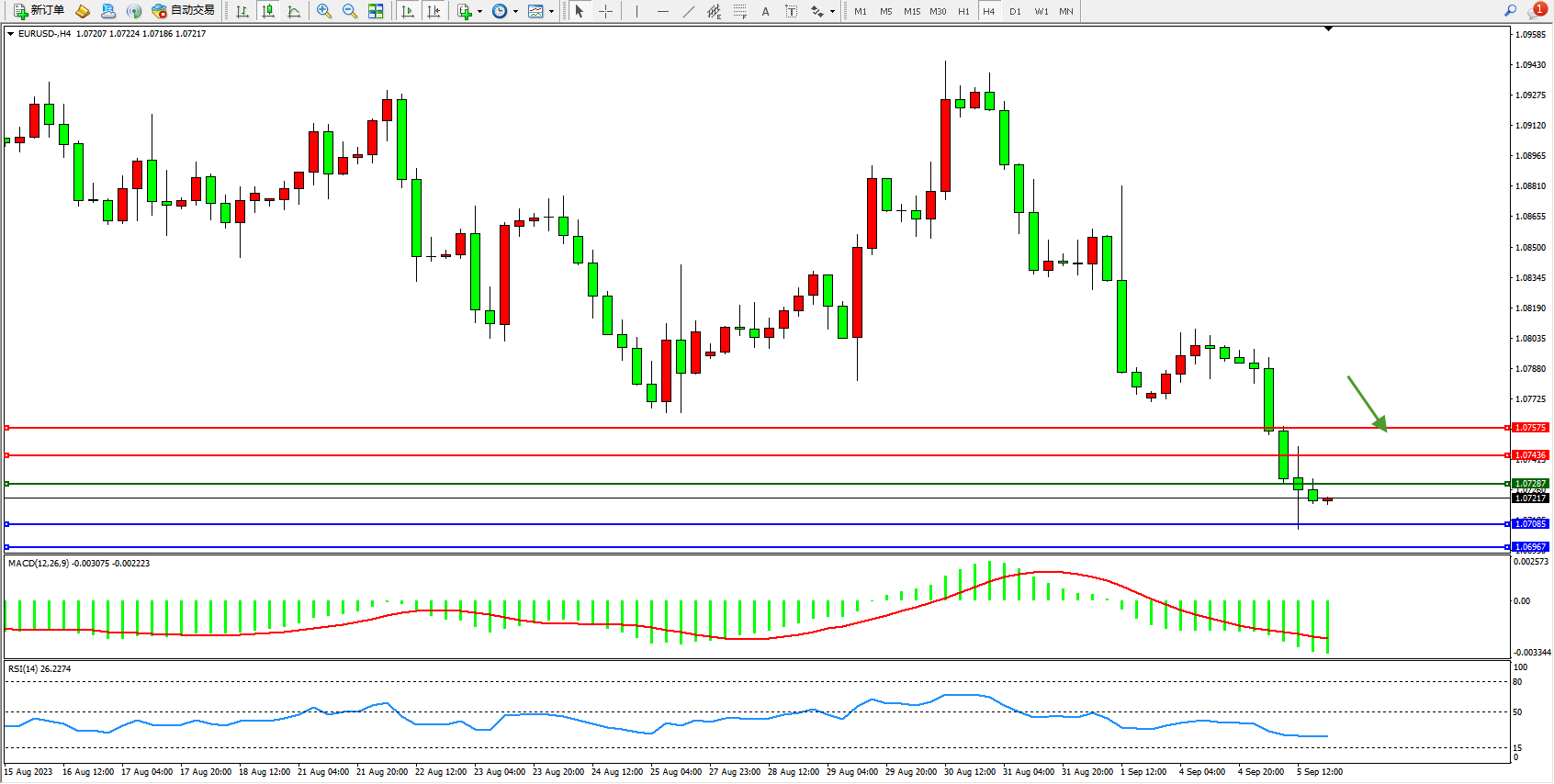 4小时图看:空头动力低位持续下行,短期跌势未见止步,市场空头情绪笼罩,MACD指标处于空头区域低位下行,RSI指标处于空头区域低位整理;