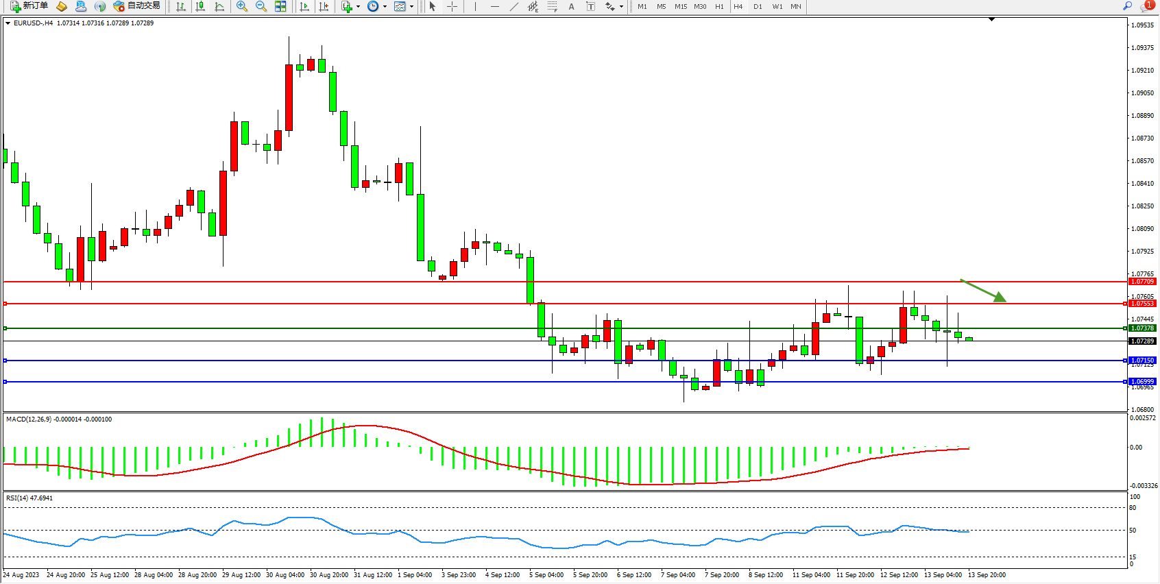 欧元兑美元维持1.07289附近震荡,欧洲央行预计欧元区20国明年的通胀率将保持在3%以上,这为欧洲央行周四连续第10次加息提供了理据。受通胀预测报导影响,货币市场反映欧洲央行9月加息机率跳升至75%。