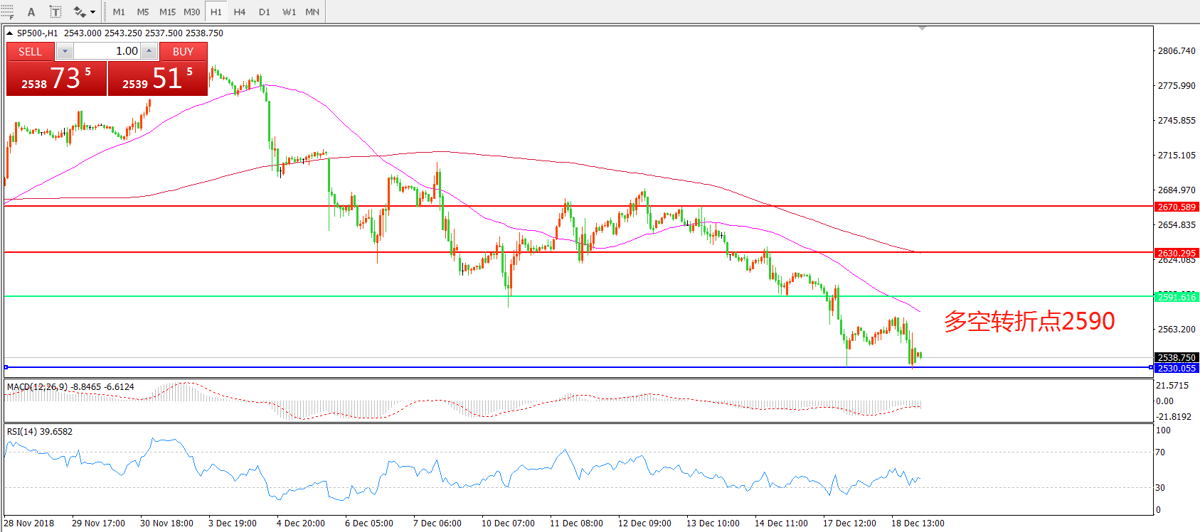 4小时图看,标普500连续下行,均线系统呈现空头排列之下, MACD绿柱增加,RSI掉头向下,短期回落风险依然较大