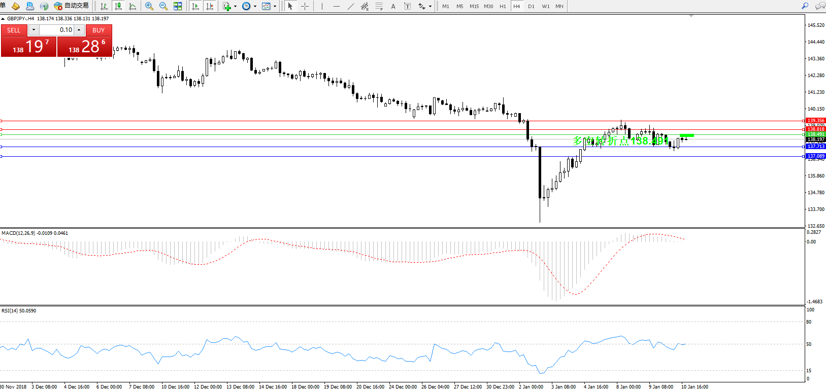 交易策略:138.491下方看跌,目标137.713、137.089