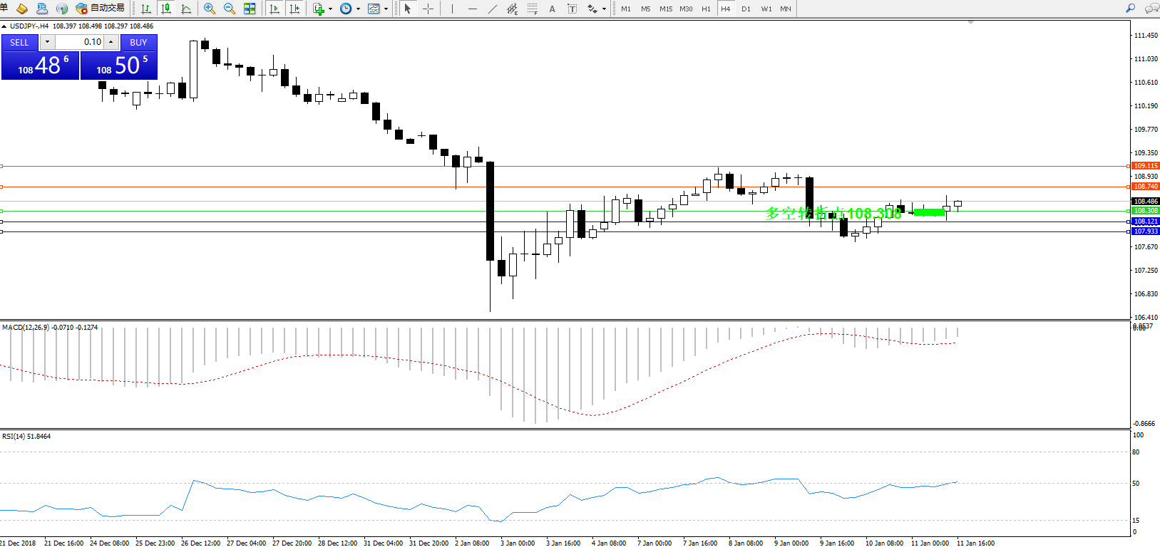 交易策略:108.308上方看涨,目标108.740、109.115